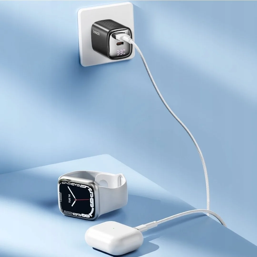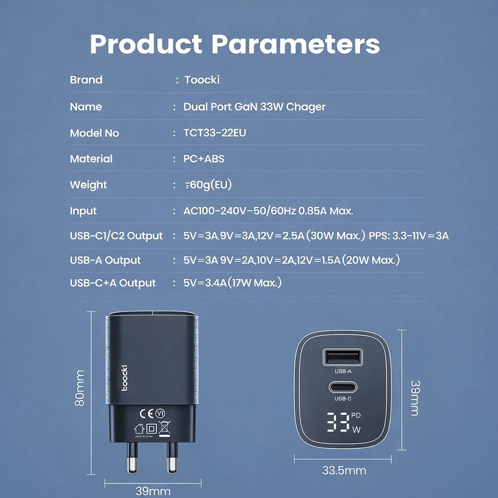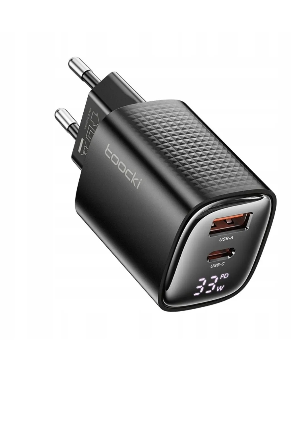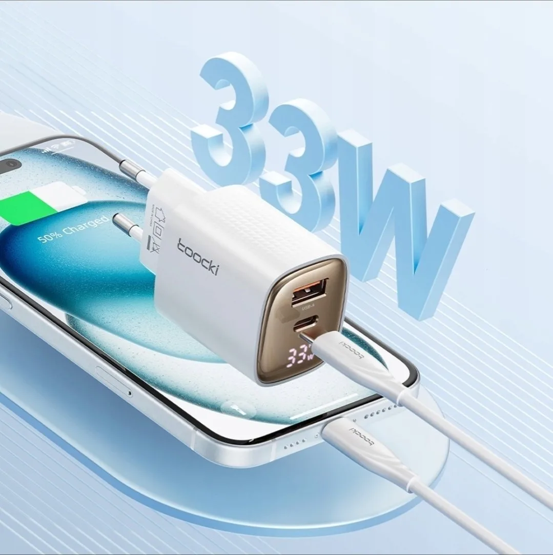 Toocki 33W GaN to kompaktowa ładowarka sieciowa USB-C / USB-A z cyfrowym wyświetlaczem, obsługująca Power Delivery i Quick Charge. Zapewnia szybkie i bezpieczne ładowanie do 33W dla smartfonów, tabletów i akcesoriów. Technologia GaN gwarantuje wysoką wydajność, niski poziom nagrzewania oraz małe wymiary. Idealna do domu, biura i podróży.