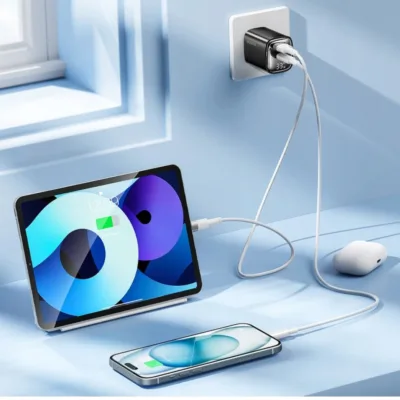 Ładowarka została wyposażona w dwa porty – USB-C oraz USB-A, dzięki czemu umożliwia jednoczesne ładowanie różnych urządzeń. Obsługa standardów Power Delivery (PD) oraz Quick Charge (QC) zapewnia automatyczne dopasowanie parametrów ładowania do podłączonego sprzętu, skracając czas ładowania i chroniąc akumulator.