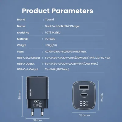 Toocki 33W GaN to nowoczesna ładowarka sieciowa nowej generacji, zaprojektowana z myślą o szybkim, bezpiecznym i inteligentnym ładowaniu urządzeń mobilnych. Zastosowanie zaawansowanej technologii GaN (azotek galu) pozwoliło uzyskać wysoką wydajność przy zachowaniu kompaktowych wymiarów, niskiego nagrzewania oraz stabilnej pracy nawet przy dużym obciążeniu.